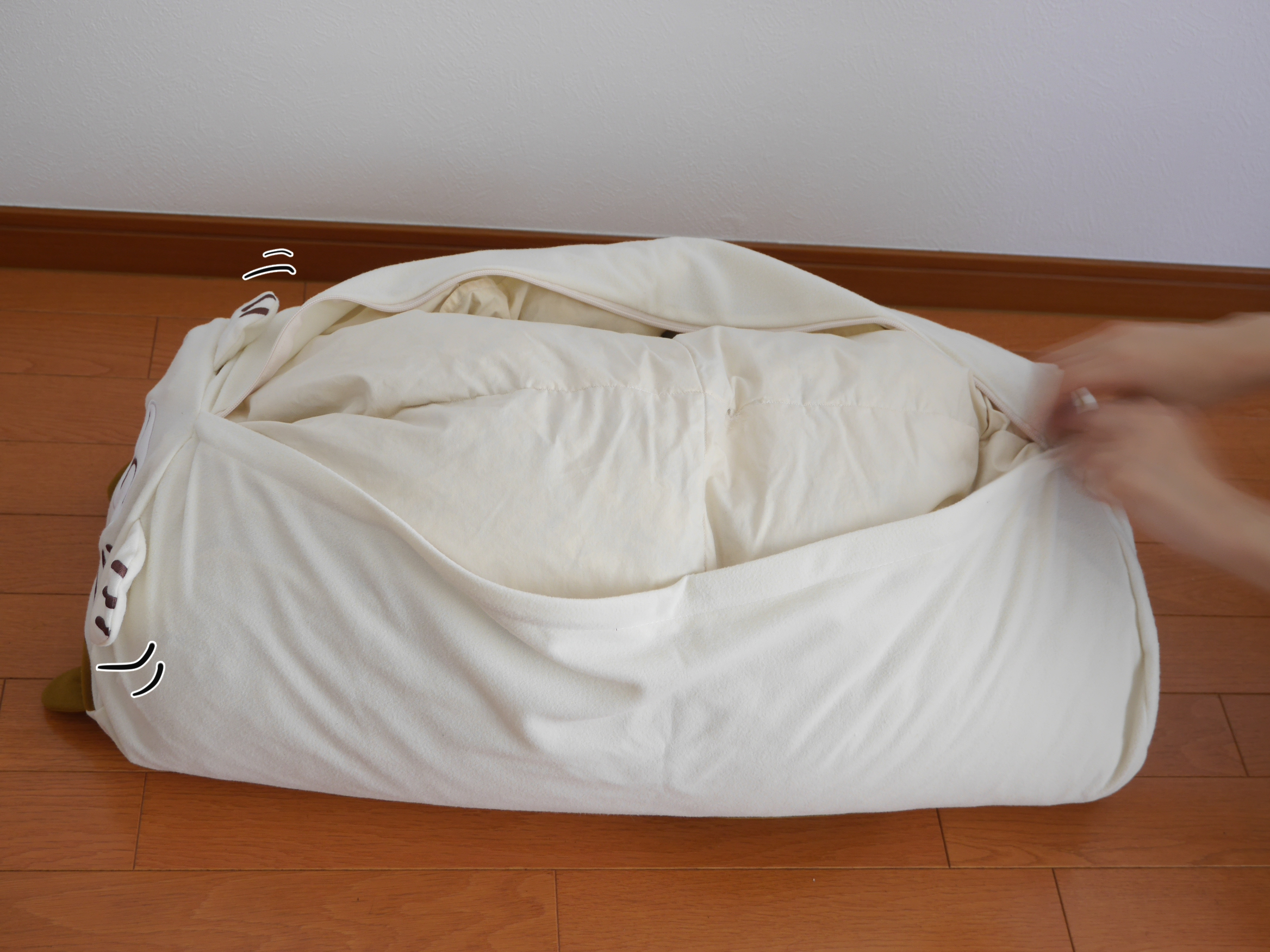 四つ折りにした羽毛布団をクルンクルンに巻いておなかにイン。この作業でぶちクンが出現し、なおかつ押入れのスペースがあくシステム。最高。