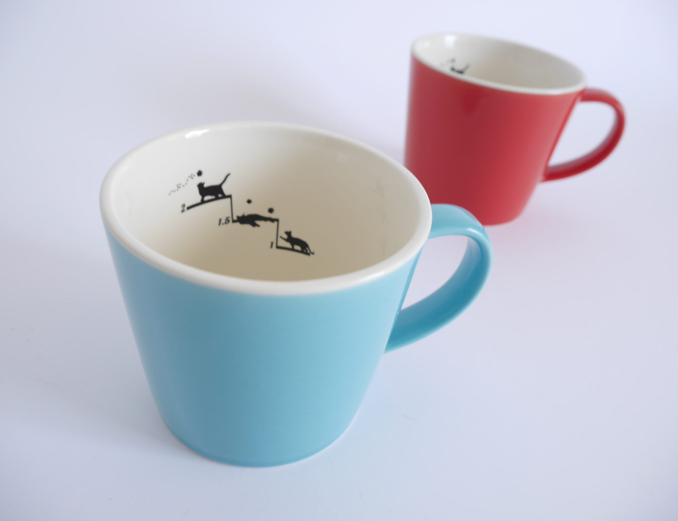 内側についた猫のイラストで約100cc、150cc、200ccが計れるマグカップ。写真のライトブルーのほかレッド、ホワイト、ネイビーの4色展開。家族で使えます。