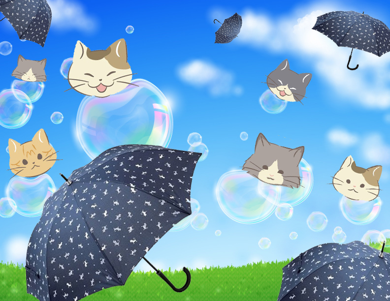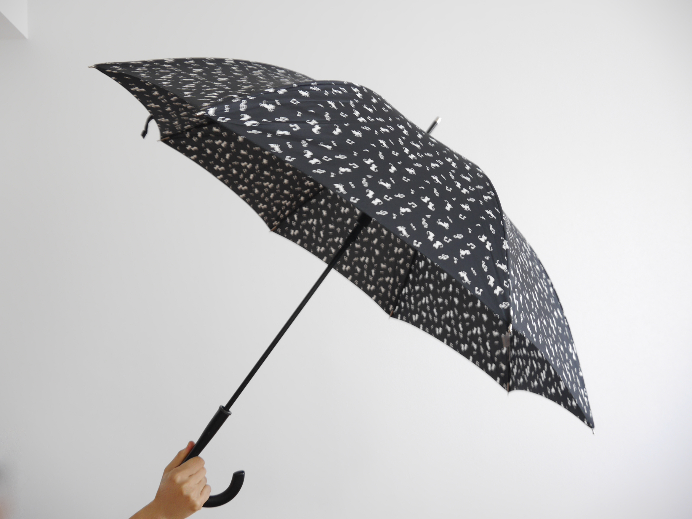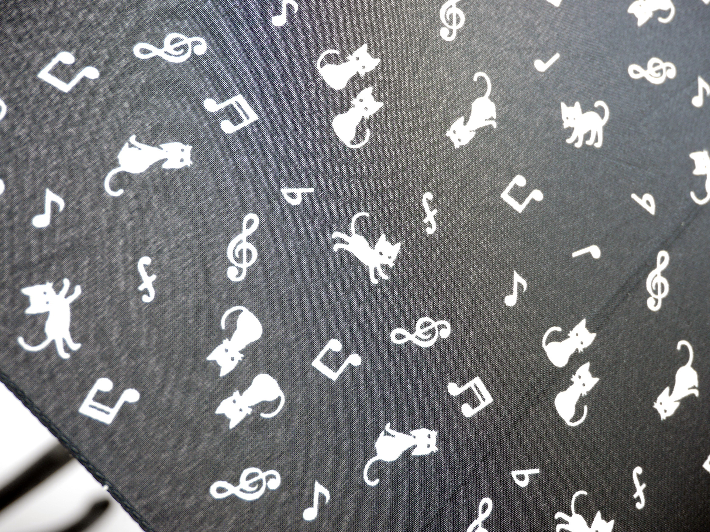 楽しげな猫ちゃんモチーフがすてき。生地は撥水加工で雨水をサラサラとよくはじぎ、乾きも早いです。