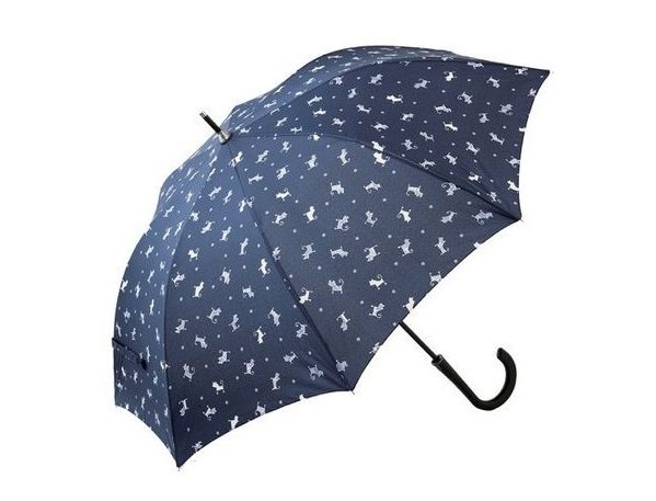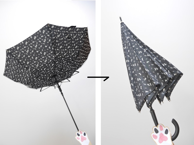 「DCMブランド 雨風に強い傘 婦人AJP耐風仕様 プリント猫」。異常気象などで暴風雨が多いこのごろですが、強風にあおられておちょこになっても簡単に元に引き戻せる「耐風Z骨仕様」の傘です。こういった傘は手開きが多いですが、こちらはワンタッチ開閉、かつ軽いグラスファイバー製。手のふさがりがちな雨の日に気がきいてます。
