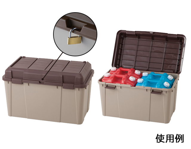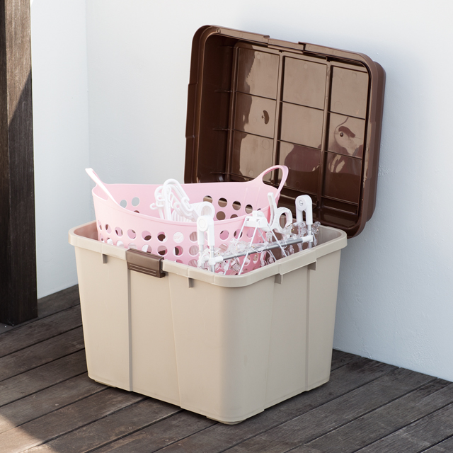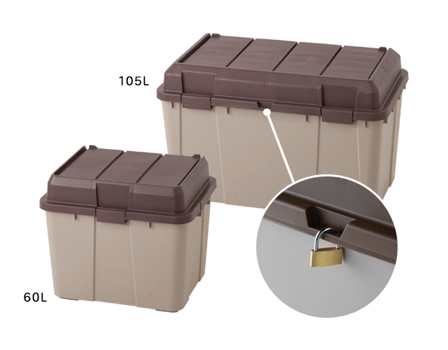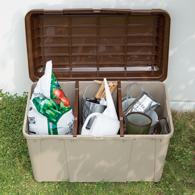 洗車道具やペット用品、園芸用品など、家の中はもちろん、外でも大活躍します。丈夫なので積み重ねて使えて、狭い場所でも収納力はバツグン!カギ穴付きで仕切り板(別売)が使える105Lタイプのほかに、60Lタイプの2種類があります。