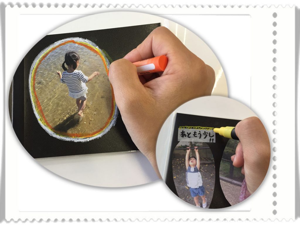 写真のフチは、これも娘のお絵かき道具である、図工クレヨンとポスカでぐるぐる描くだけ!