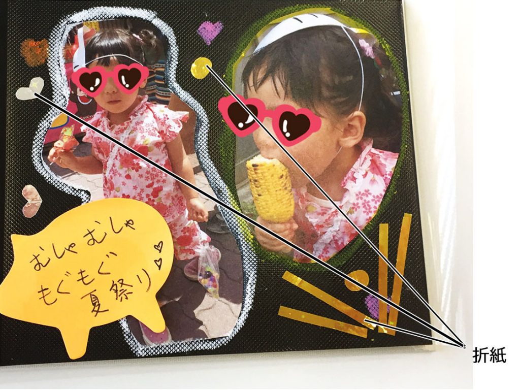 キラキラした折り紙を適当に細長く切って貼れば、お祭りの雰囲気にもぴったり!