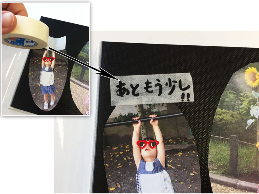 マスキングテープも。百均で売られている模様付のもかわいいですが、旦那の工具箱にある普通の養生用も十分役立つ。しかも安い。文字も書けるし、黒背景とカラー写真だと、白や黄色がちょうどいいかも。