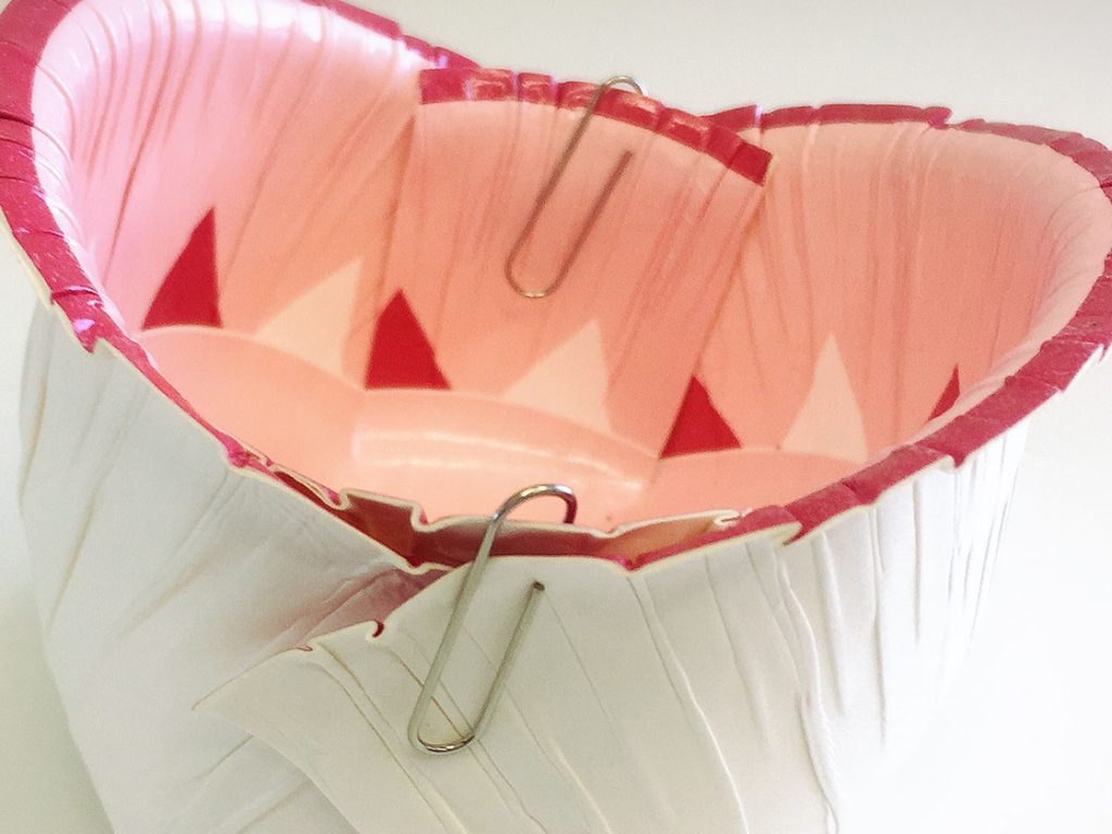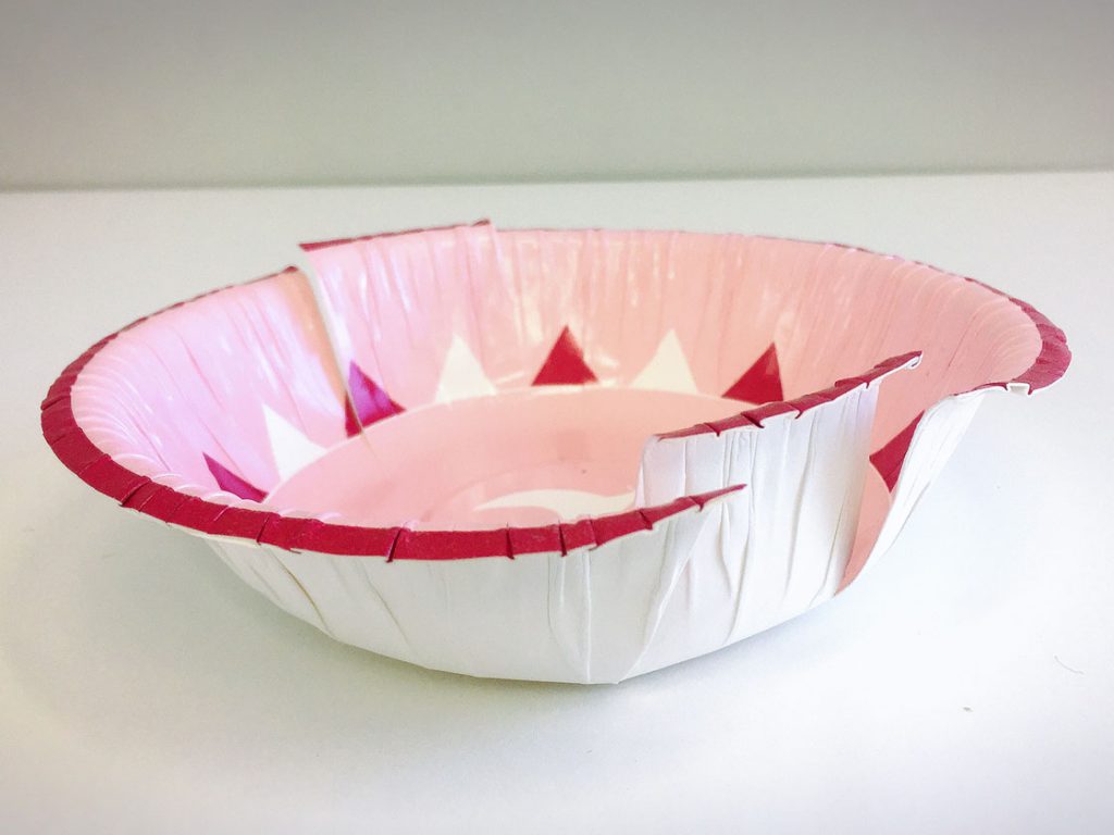 せっかくのママ友会だから、もう華がほしいなぁ。そして、お土産用菓子のラッピングはどうしよう。紙ボウルと紙コップをそのまま改造して使えないかな。(どこかで見たアイディアです。) ネットでやり方を調べて、いざ作業開始。時間はあと40分しかない。紙ボウルは、両サイドのほぼ同じぐらいの位置で切り込みを2カ所入れて、
