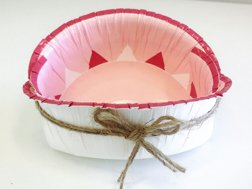 普通の白の紙ボウルは、色付きのワックスペーパーを入れてちょい飾り。