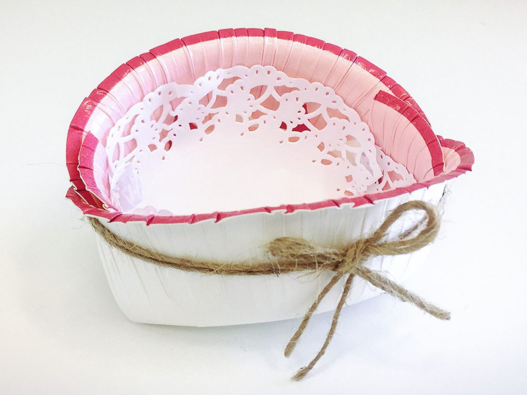 器としてもう完成だけど、かわいらしさをもうちょっとプラスしたい。お菓子の下敷き用レースペーパーを入れてみました!