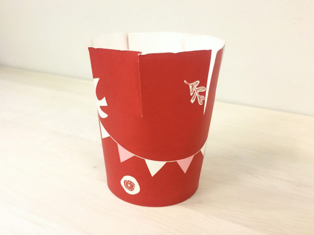 お土産用のお菓子のラッピングは、紙コップでアレンジ。紙コップのフチを切り取って、周囲に均等に切り込みを入れる。(ここも適当...)