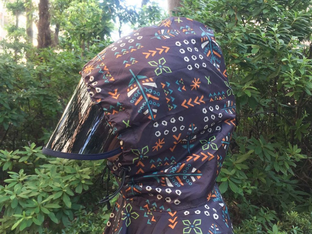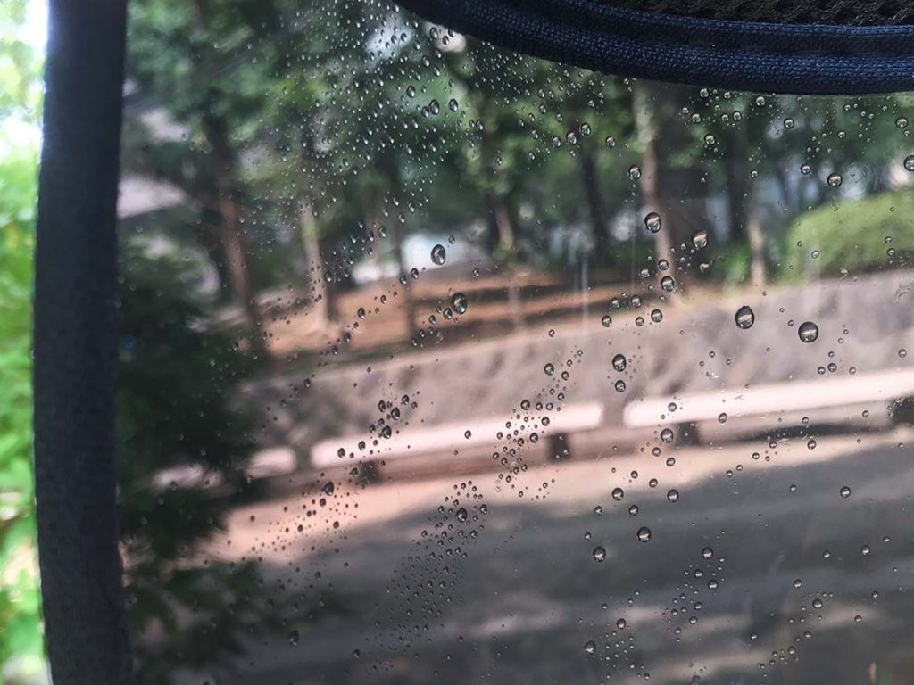ポンチョだけでは、顔がびしょ濡れになって見えなくなる。秘密兵器はサンバイザー!多少暗くなるけど、雨から顔をしっかり守ってくれる救世主です。しかもスライド式で、風の方向にも対応!ますます怪しい人ですが、これなしに雨の日の登園はできません!そんなサンバイザーも、欠点がある。雨に濡れると、前がよく見えなくなる。