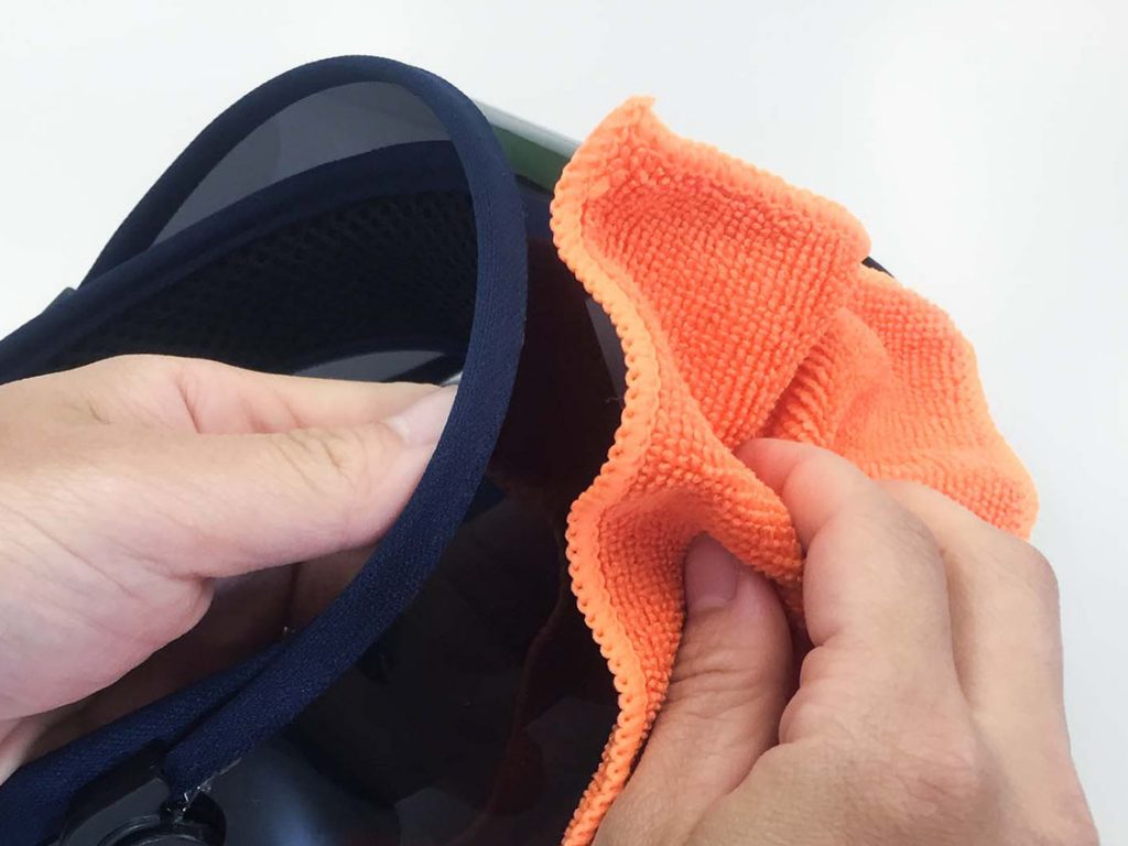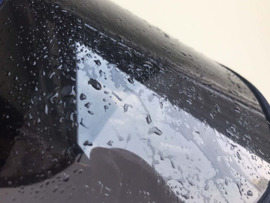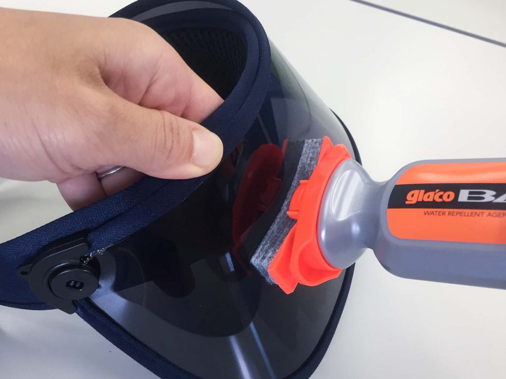 車みたいにワイパーがほしいわ。前が見えないとさすがに危ないので、車の窓ガラス用の撥水剤を塗ってみました。使ったのは樹脂にも使えるシリコン系の撥水剤。