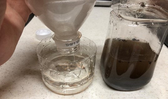 作り方は大きいペットボトルなどを逆さにしてそこを切ったら、順に不織布、炭、砂、小石、といった感じで目の細かいものから順に詰めていくそうです。無理ですね。