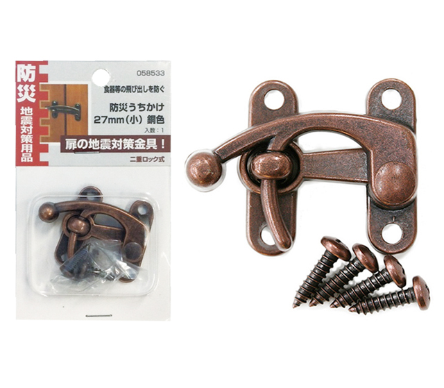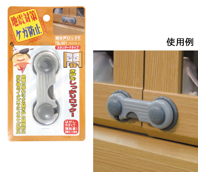 地震の時に食器棚などの扉を開かないようにし、食器などの飛び出しを防ぎます。二重ロック式なので、地震による揺れでロックがはずれる心配もありません。付属品:取付ネジ