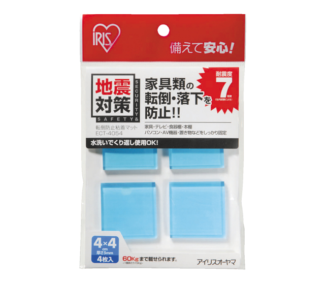優れた粘着性により家具などの底面に貼るだけで、地震による転倒・落下を防止する粘着マットです。きれいにはがせるので接着面を痛めず、水洗いをすることで繰り返し使用できます。4枚入り。サイズ:約幅4×奥行き4×厚さ0.5cm耐荷重:4枚で約60kg(1枚当り15kg)