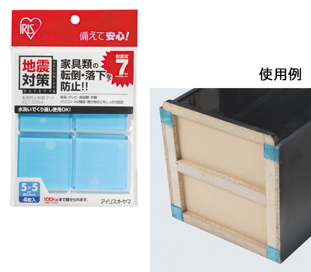 優れた粘着性により家具などの底面に貼るだけで地震による転倒・落下を防止する粘着マットは、きれいにはがせるので接着面を痛めず、水洗いをすることで繰り返し使用できます。