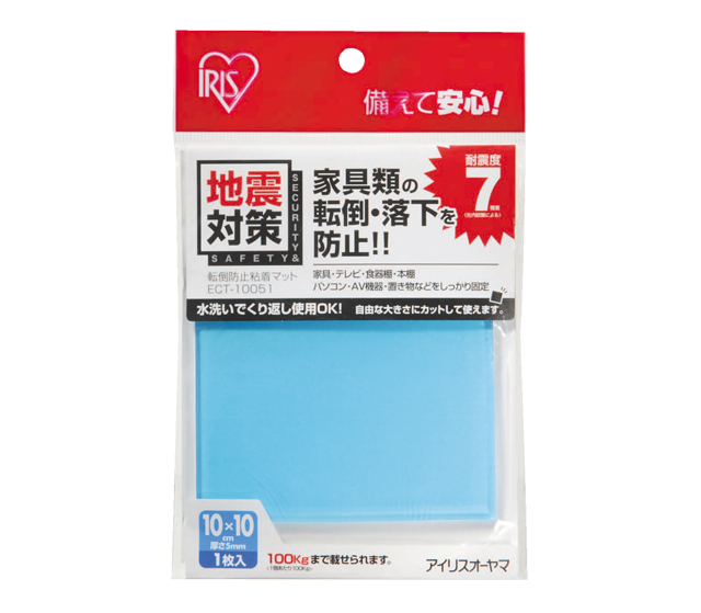 優れた粘着性により家具などの底面に貼るだけで、地震による転倒・落下を防止する粘着マットです。きれいにはがせるので接着面を痛めず、水洗いをすることで繰り返し使用できます。1枚入り。サイズ:約幅10×奥行き10×厚さ0.5cm耐荷重:100kg(1平方cm当たり約1kgを目安に)