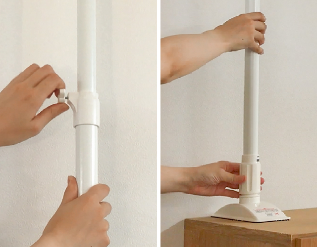 取り付ける高さに寸法を合わせネジで固定し、アジャスター部分で調整して天井と家具をしっかりと圧着します。工具不要なので女性でも簡単に設置することができます。