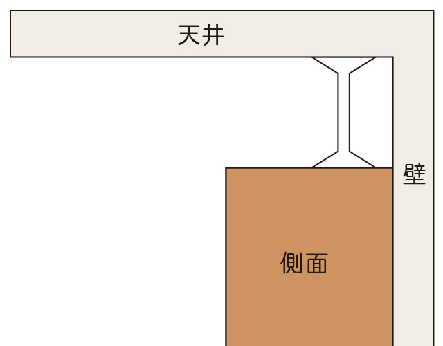 家具が手前に倒れるときは奥側が持ち上がるため、天井と垂直に家具の奥側へ取り付けます。
