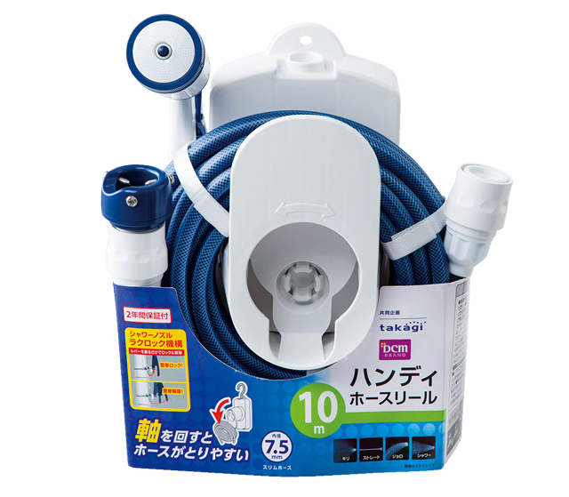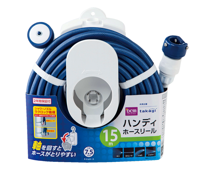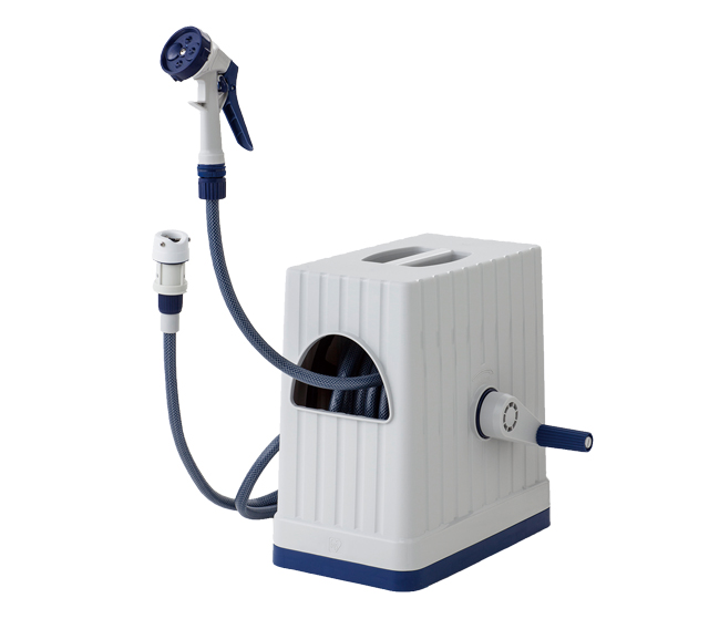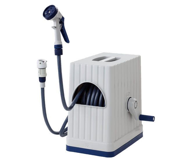ホースを紫外線や汚れからしっかりガードするフルカバータイプのホースリールです。ホースには耐圧糸が入っており、防藻機能も付いています。多機能アクアガンノズルは水流が4パターン(霧・ストレート・拡散・シャワー)に切替可能で、バケツ引掛けフックも付いています。20m巻。ホース内径:12mm
