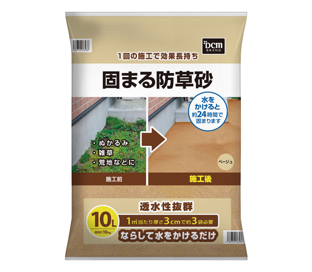 しつこい雑草の発生を予防する防草砂です。雑草を取り除いた後に地ならしし、防草砂を敷き詰めまんべんなく水を撒いておくと約24時間で固まり、雑草の発生を抑止します。透水性があるので、固まった後でも雨水などを吸収して地面下に通します。ヒートアイランド対策にも効果的。目安:1平方メートルあたり厚さ3cmで約3袋必要主原料:セメント、珪砂、顔料重量:約10kg※パッケージは異なる場合があります。