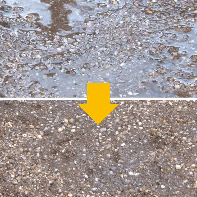 雑草を取り除いた後に地ならしし、防草砂を敷き詰めまんべんなく水を撒いておくと約24時間で固まり、雑草の発生を抑止します。しっかり固まり、しつこい雑草を生やしません。