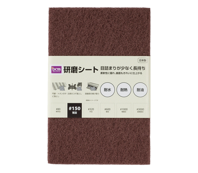 目詰まりが少なく長持ちする研磨シートです。柔軟性に優れ、曲面もきれいに仕上がります。門扉・トタンのサビ落とし、五徳のコゲ落とし、溶接部の焼け取りなどに。目:荒目番手:#150