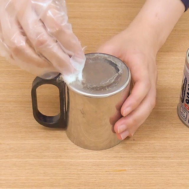 使う前に缶をよく振り、柔らかい布に適量を付け、汚れが取れるまで磨きます。磨き終わったら、別の柔らかい乾いた布でよく拭きとります。
