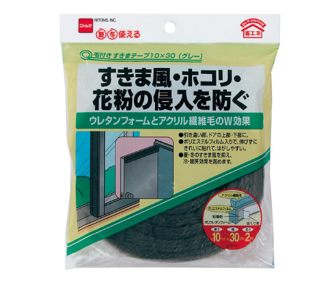 アクリル繊維の長い毛足が、一般用のすきまテープより風・ホコリ・花粉の侵入をしっかり防止します。毛足の長さが貼り方によって調整でき、いままで使用できなかった場所にも対応可能です。扉の上部・下部のすきま・サッシ枠のひき違い部分に最適♪サイズ:1cm×3cm×200cm入数:1巻
