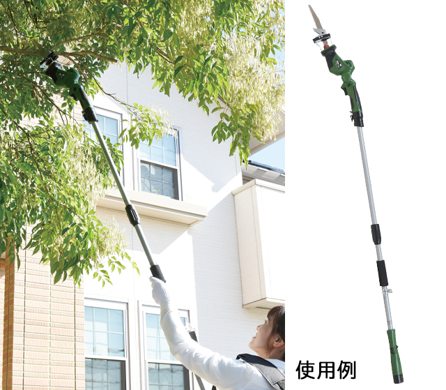 脚立にのぼって手作業で剪定をしていた高所の作業もこれ1台あれば自分で出来る!枝切り刃を使えば太さ約8cmの枝もラクラク♪枝を押さえて剪定できる枝キャッチャーも付いているので剪定した枝の処分にも便利です。