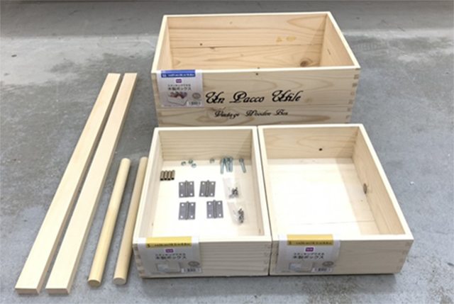 ・DCM スタッキングできる木製ボックス LL ナチュラル・DCM スタッキングできる木製ボックス S ナチュラル×2個・角材、丸棒(持ち手部分の木材)