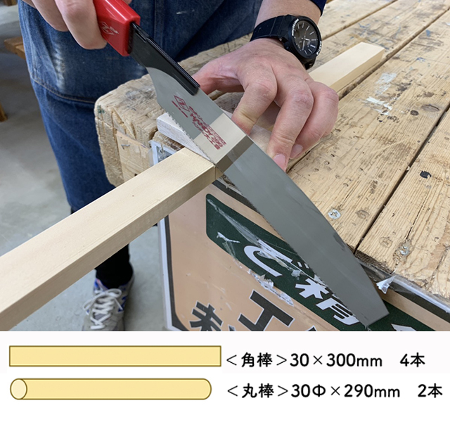 持ち手部分の木材を切断します。角材は木製ボックスとの組合せ部分に、丸棒は持ち手部分として使います。