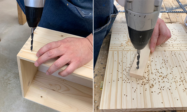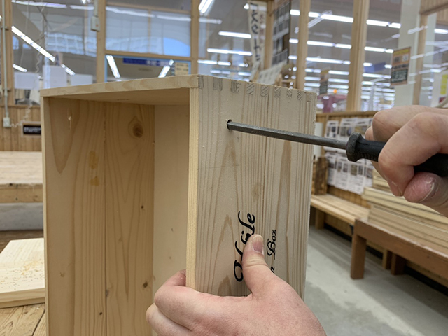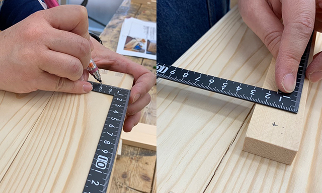木製ボックスと持ち手部分の木材それぞれ、穴をあける位置に印をつけていきます。