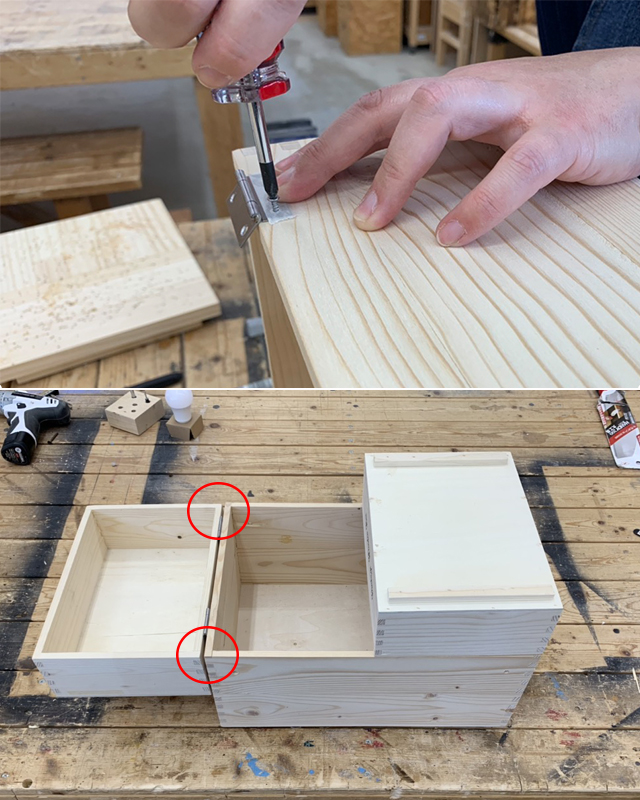 木製ボックスに蝶番を取り付けて、組み合わせます。丸の位置に蝶番を取り付けます。反対側も同様に取り付けます。