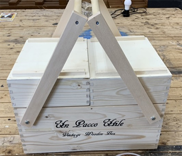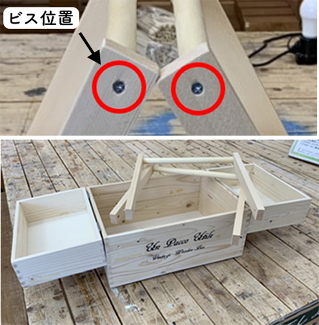 角棒と丸棒をビスで固定し、持ち手部分を作成します。木製ボックスと持ち手部分をボルトとナットで固定します。