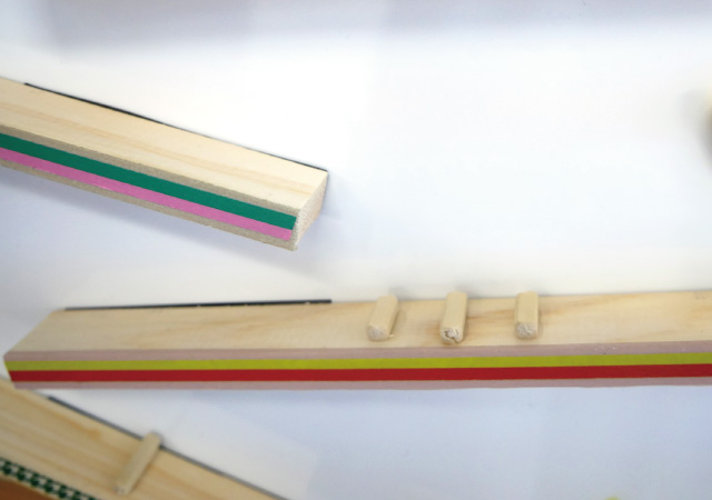 材料のサイズ【コース用】×5本約高さ1cm×幅2cm×長さ25cm※コースの長さは、使用するホワイトボードのサイズに合わせて調整しましょう。【ゴール部分】●ゴール土台×1本約高さ1cm×幅2cm×長さ14cm●ゴール囲い(割りばしをカット)A:約13cmB・C:約1cm