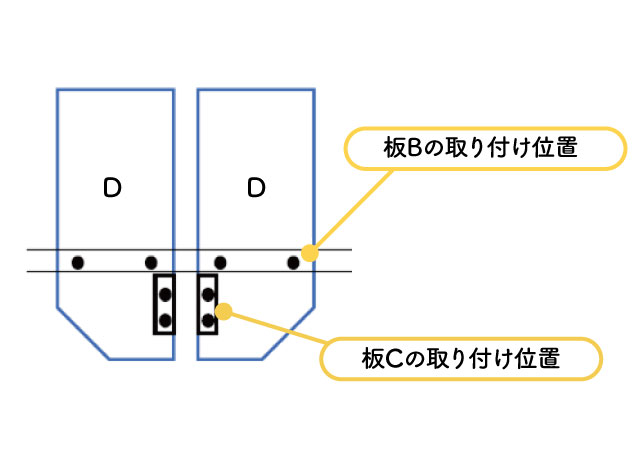 板Dの印付けは板Bと板Cの取り付け位置を決めてから。板BとCの間のすき間はあってもなくてもどちらでもよいです。