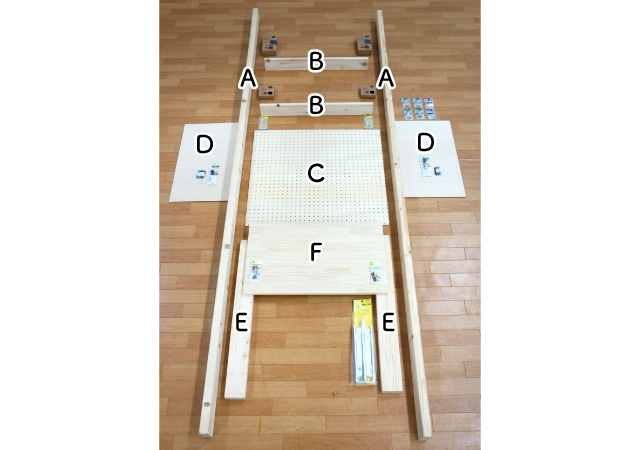 まず初めに、材料の確認をしましょう。組み立てた後のイメージをしながら仮置きをして、足りないものが無いか、どこに何を置くか確認します。※この時取り付け場所、テーブル取り付け位置などの寸法を確認していると作業がスムーズに進みます。※充電式のドライバーを使用する場合は充電を忘れずに!