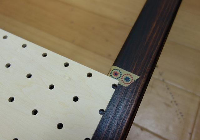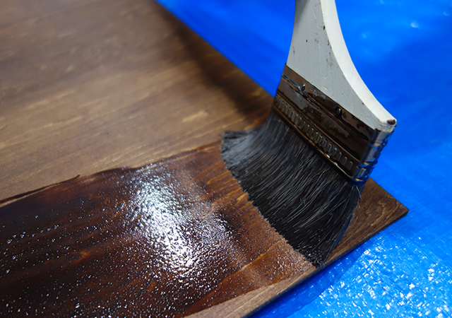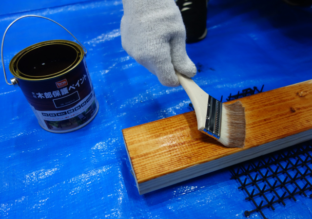 刷毛を使って木部塗料を塗って乾燥させます。最初はペンキが沈殿しているため、棒などでかき混ぜるとムラなく塗れます。塗り終わって乾燥が確認ができたら再度塗装します。2回塗ることで塗りムラを減らすことができ、きれいに仕上げることができます。ビニールシートを敷いて、猫よけの上に木材を載せて塗ると直置きしないでも塗ることができます。木材の種類によって色の出方が変わるので、その点も注意しながら塗りましょう。色を塗り終え、乾燥させたら木材をもう一度仮組の状態に戻します。※塗装・乾燥作業は必ず換気の良い環境で行ってください。