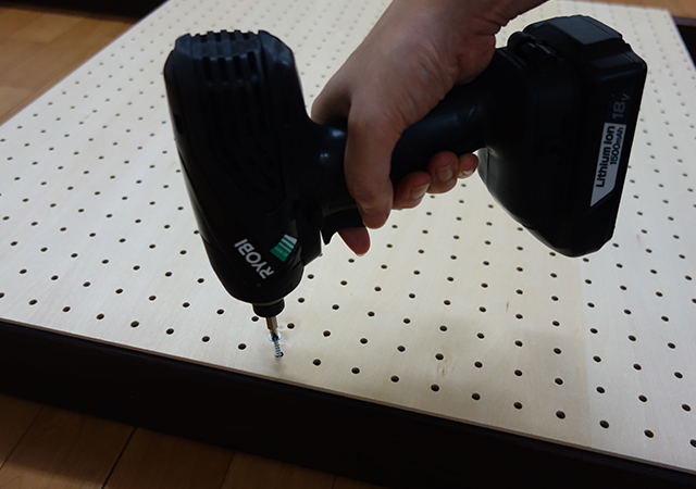 取り付け位置を決めたら、棚板(木材B)にシェルフサポートを付属のネジで固定します。シェルフサポートをつけた棚板(木材B)を柱(木材A)にネジで固定します。有孔ボード(木材C)の取り付けは、穴が開いている位置であればそのまま穴に合わせてネジで固定します。空いていない場合は下穴を開けてネジで固定します。