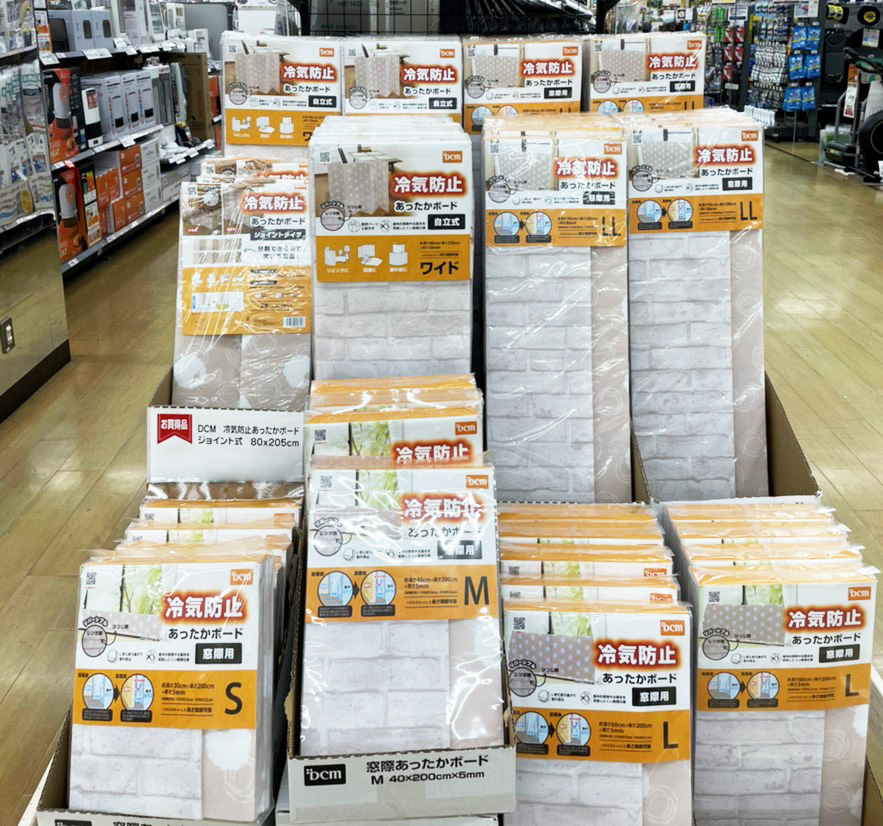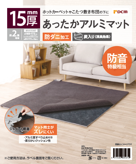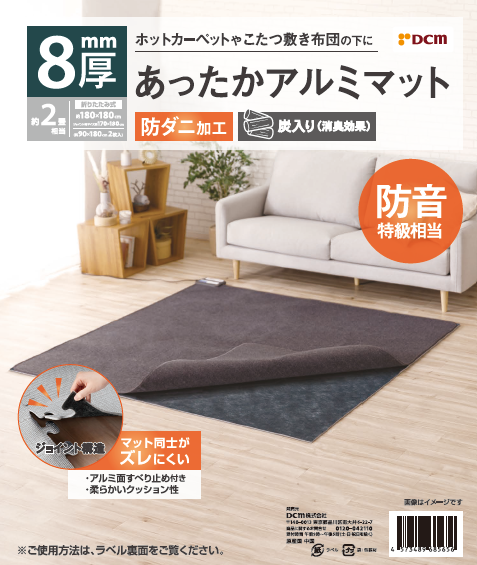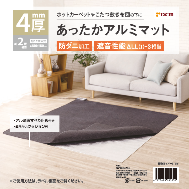 冬の床は冷たくてお尻や足が寒い。。。そんな悩みを解消してくれるのがこの「DCM あったかアルミマット」店舗でも目立つところに置いてありました。ホットカーペットやこたつ敷布団の下に敷くことで床の冷気を遮断してくれます!電気代もかからない優れものです!
