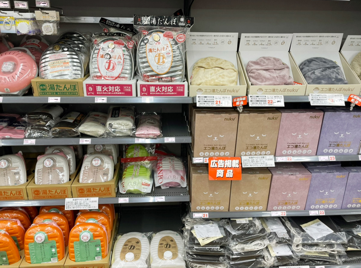 湯たんぽのコーナーです。湯たんぽと言えば金属製のものやプラスチック製のものを思い浮かべる方が多いのではないでしょうか。上の写真でも目立っていますね。あれ、右側に、、んん???