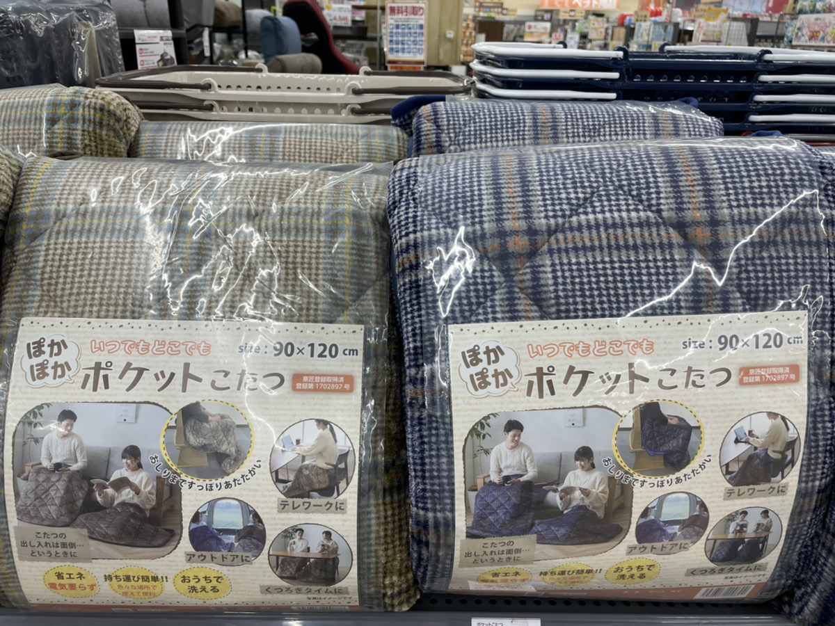 振り返ってみるとそこには「ポケットこたつ」これもまた聞き慣れない商品です!季節が変わってこたつを出すのが面倒・・・というときにササっと出すことができるのでありがたい!しかも本来のこたつのように位置が固定ではないので様々な場所で使えて便利ですね!電気要らずなので省エネです!!!!!!!