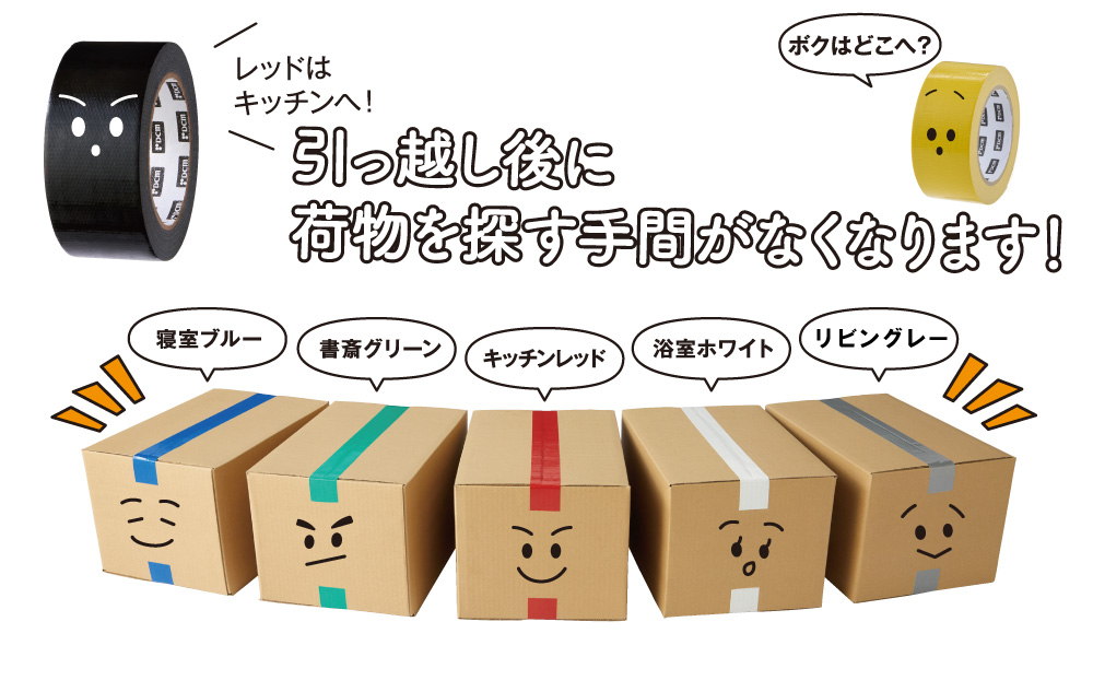 例えば、「青いテープ」は寝室用に、「赤いテープ」はキッチン用品、「銀色のテープ」を使えばリビングに置くもの、といった具合に、荷物の中身がどのカテゴリに属するかを瞬時に判断できるようになります。
