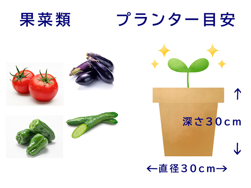 - 野菜別 プランターの選び方 果菜類(トマト、ナスなど)直径、深さ30cm以上必要