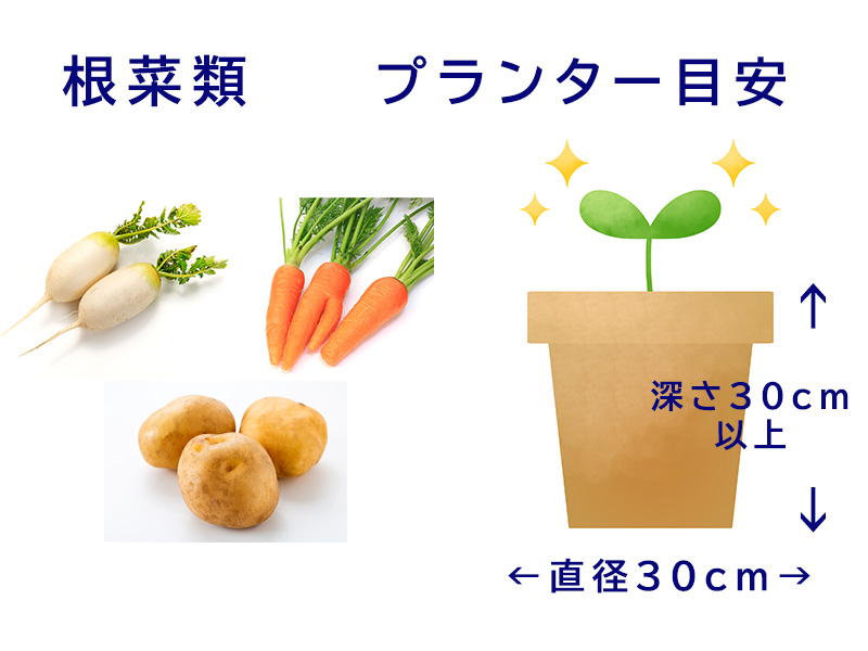 根菜類(ニンジン、ミニダイコンなど)深さ30cm以上必要