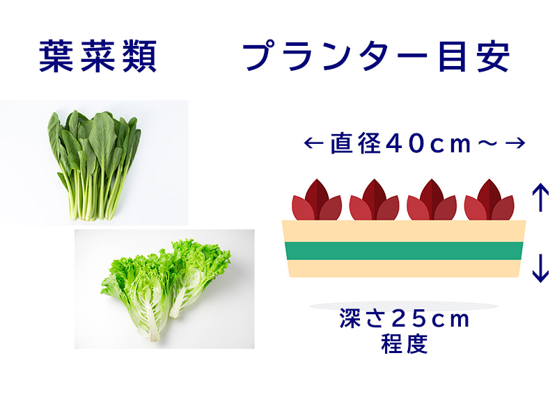 葉類(コマツナ、リーフレタスなど)深さ25cm程度必要