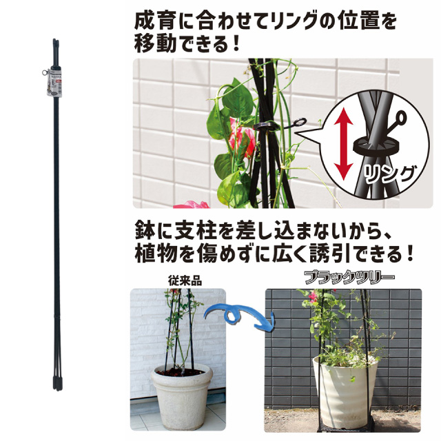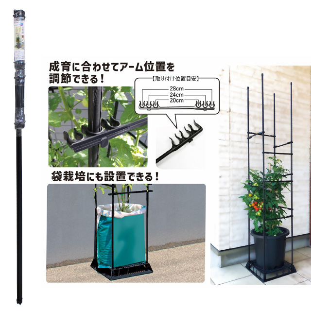 太さ11mm、支柱高さ150cm成長に合わせて移動できるサポートアームがセット。露地栽培の他、ブラックベースの四隅の穴に刺して使用でき、強風などによる倒伏防止にもなります。地面がアスファルト、コンクリートの場合はブラックベースが必要です。JANコード:4968438026336※ご購入はお近くのDCM店舗へお問い合わせください。