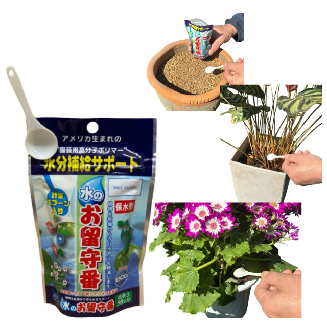土1リットルに対して約1gを土に混ぜる。最大7日間水やり不要、土を乾燥から守ります。付属品:計量スプーン(約3g)。JANコード:4967740011252