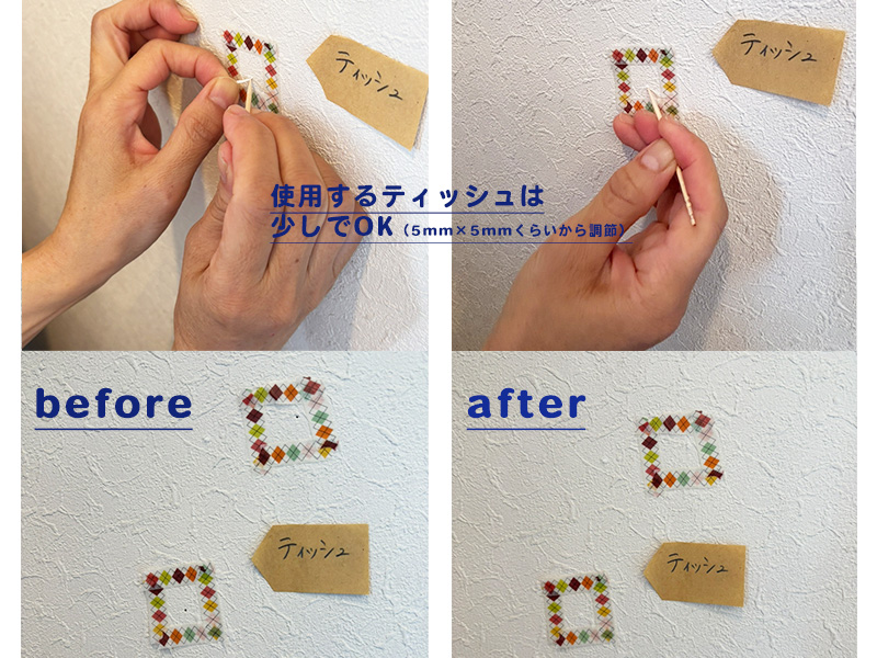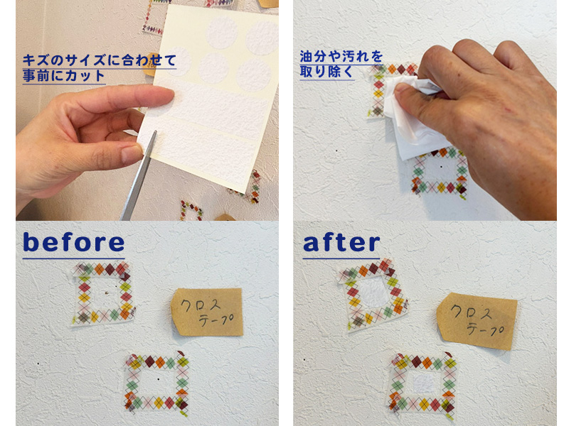 一時的な補修にはティッシュや紙粘土、耐久性とよりきれいな仕上がりを求める場合は穴埋めパテやクロステープをおすすめします。ティッシュや紙粘土は、パテなどの専門的な補修材と比べると、強度はほとんどありません。理由は壁と密着しないからで、ここでわずかな隙間から湿気が侵入すると、変色やカビ、ひび割れの発生に繋がります。ティッシュや紙粘土での補修は、あくまで一時的な応急処置として捉える方がよいでしょう。貼ると壁に粘着するクロステープの使用や、さらに安心・確実で長期的なキレイさを求める方には、穴埋めパテがおすすめです。乾燥後に硬化し、高い強度を保ちます。どちらも色選びがポイントですが、きちんと選べば自然で、壁を傷めず補修することができます。