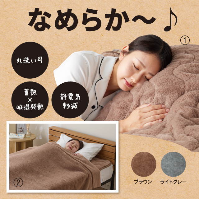 ①あったか敷きパッドシングル 約100×200cm②あったか毛布シングル 約140×200cm思わず頬ずりしたくなるなめらかさ!心地よいぬくもりに包まれて、ベッドから出られなくなってしまうかも。