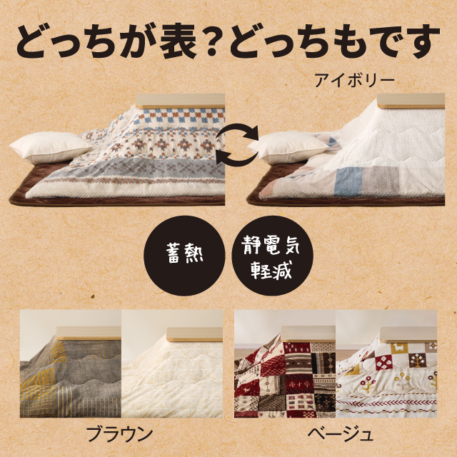 約190×190cm2つのデザインを楽しめるリバーシブル仕様!こたつふとんをクルッとするだけで、お部屋の模様替えも簡単。